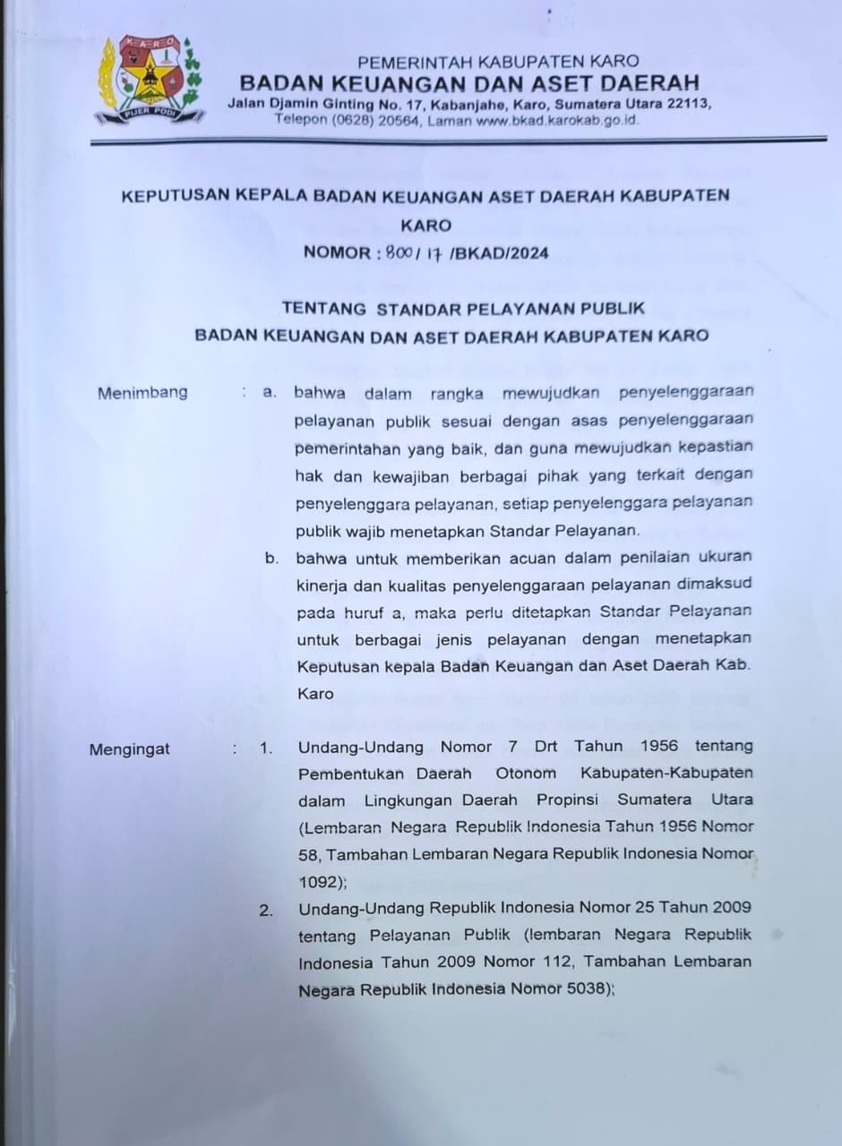 Standar Pelayanan Publik Badan Keuangan dan Aset Daerah Kabupaten Karo